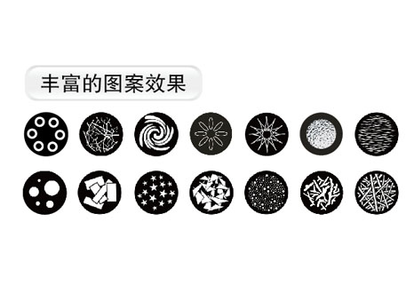 1个固定图案盘,1个旋转图案盘,14个可更换图案片(可选配),具有变速抖动效果、双向变速流动效果