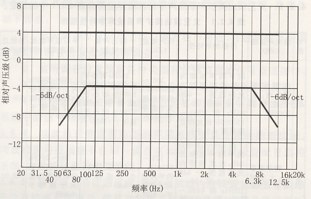 以125~4000Hz的平均声压级为0dB,在此频带内允许范围:-4dB~+4dB;63~125Hz和4000~8000Hz的允许范围见下图: